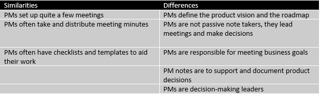An organization often would start out with a PM that does it all. When the workload becomes such that the role has to be divided, the PO role is introduced. The PO covers the internally focused responsibilities of the product management role. PMs and POs have regular meetings, often multiple times a week, to ensure market-driven alignment between the long term goals and the short term effort.